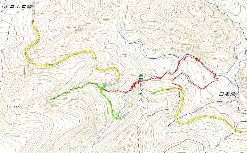 駐車地点(440m・08:50発)到着時は霧雨状態、入渓(325m白老岳橋より・09:05)地点では小雨となる。水量は当然多めだが濁りはない。どこまで登れるか「不安」を胸に遡行開始である。雨足がこれ以上強くなると「行動停止-引き返し」だが、幸運(?)なことにまた霧雨→曇りとなる。最初の滝2つをクリア(入渓して30分・09:35)し先へ進む。10:15今日一番の難所となったゴルジュに着く。ここのへつり通過に25分ほど費やし慎重に全員無事通過する。