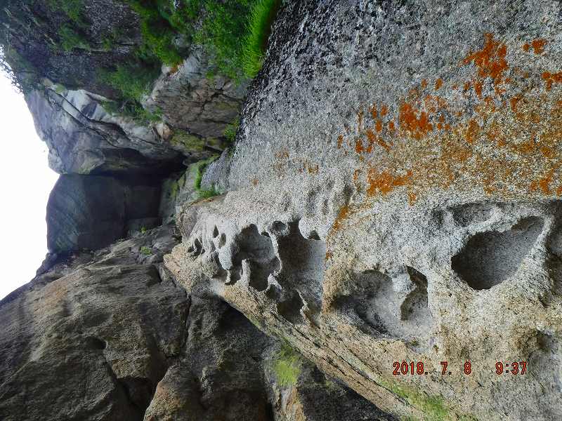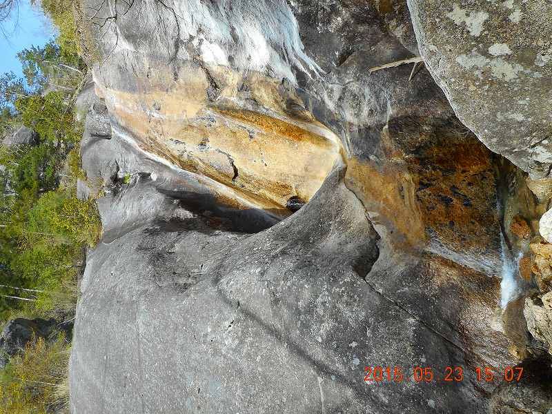 写真2:カンマンボロン まさか熊の足跡では? 否! 垂直の壁。天井の岩までは比高40mくらいとか(写真では迫力が再現できない)。