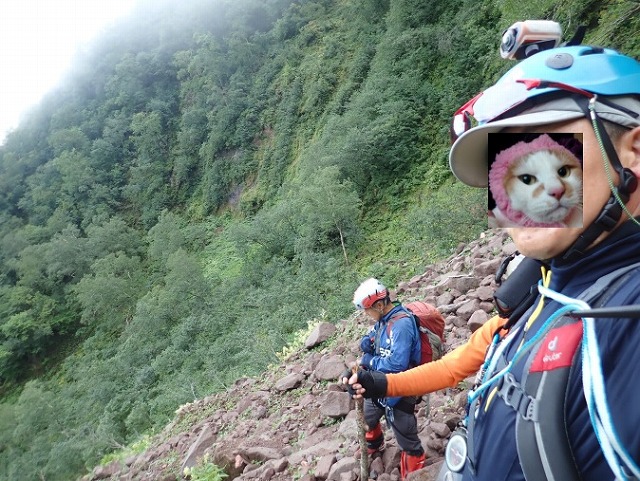07:54 F4・610m付近 右側のルンゼを登る。崩れやすく落石に中止が必要、一人ひとり登り切ってからスタートする。途中からロープあるも、ロープにつかまりながら登るときの方が落石の危険が多く最後まで登り切ってから声かけして次の人がスタートした。
