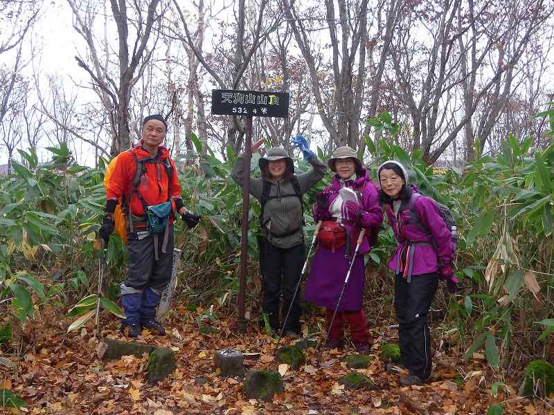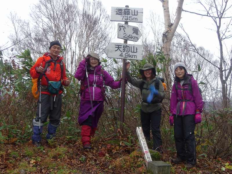 札幌から出発するときは雨であったが、小樽に近づくにつれ曇りとなる。丸山駐車場出発時は今にも雨が降り出しそうな空模様であったが、途中、丸山頂上手前から1時間ほど雨に降られた程度であった。風は、木々・笹が大きく揺れてゴーゴーと音をたてていたが、登山道はそれほど強くはなかった。登山道はしっかりと笹狩りされており、とても歩きやすかった。(下り、落ち葉に隠れて滑りやすい個所はあったが、慎重に歩みを進めた。)計画より1時間早く、総行動時間5時間30分で無事ミニ縦走を完了しました。丸山の駐車場には我々の車のみ、車回収に戻ってきたときもほかの車はなかった。於古発山を過ぎたところで2人組の若ものパーティーとすれ違う。帰りは塩谷駅からJRで帰ると言っていた。