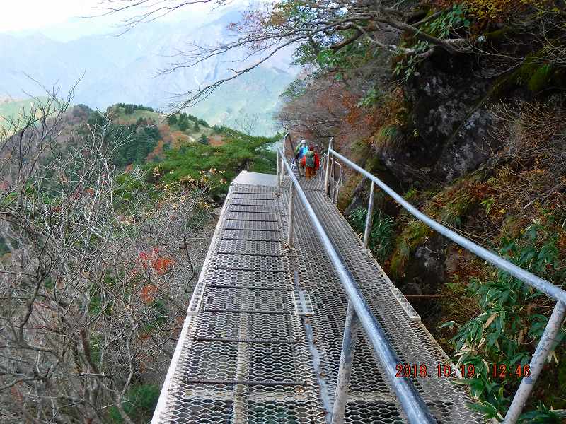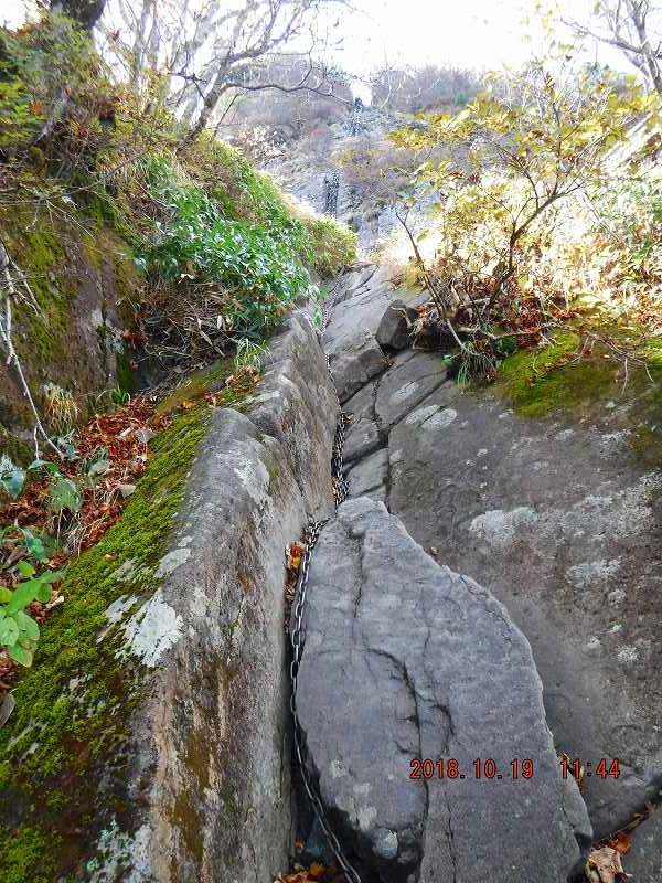 前半は普通の山道(「階段工」は多い)だが,後半は屏風のように急峻だ。石鎚山は中央構造線の(線上ではない)南側に位置しているが,大規模な断層運動による断層崖とのこと。現在,各々の鎖場には人工的な迂回路が完備されているが,昔の修験者は大変だったであろう。4つの鎖場は長かった。