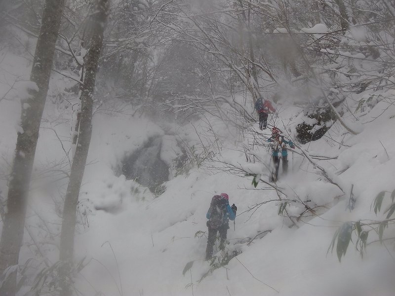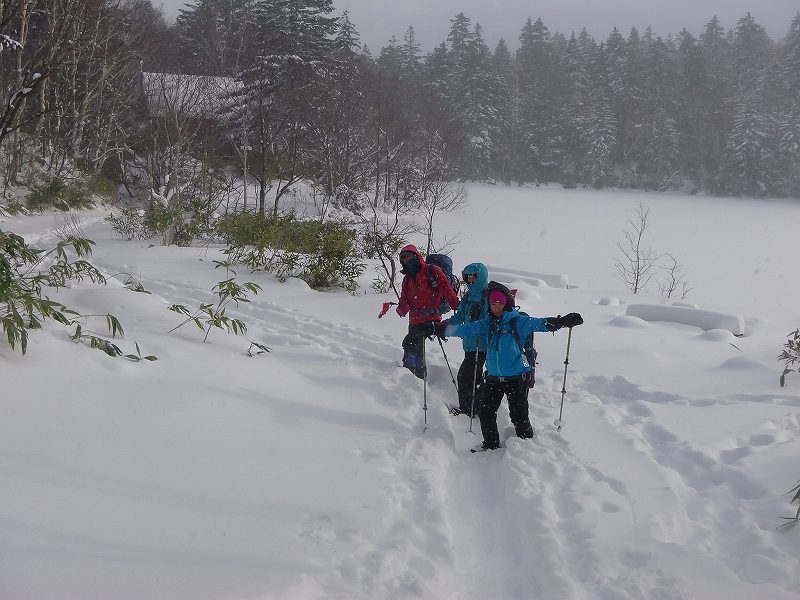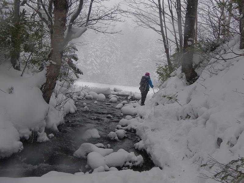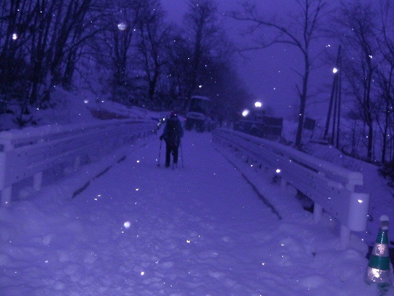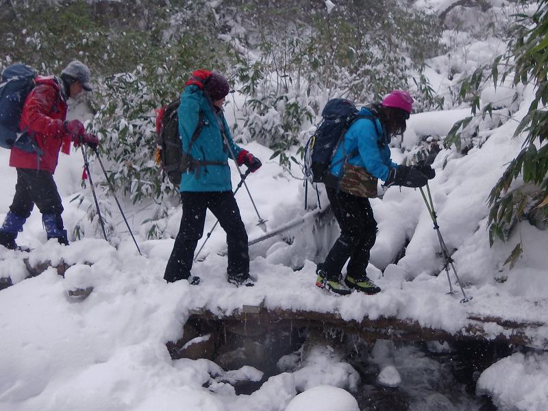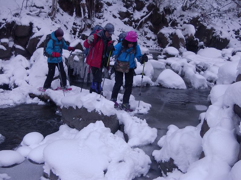 今冬シーズン初めてのスノーシューハイクは万計山荘までとなった。空沼岳は遠かった~~ トレースもばっちりあり、ツボでも歩けそうではあったが、せっかく持参したスノーシューを履き歩き始める。(07:15) 最初の渡渉点(登山口手前)2個所はなんとかシューを履いたまま通過したが、780m地点での渡渉で2名シューを履いたままでは難しいと判断しツボで渡ることに。(その後、万計山荘までツボのまま歩くがまったく問題なかった。)万計山荘着11:45、4時間30分かかった。万計山荘から先はまったく踏み跡がなく(トレースなく)時間的にもこれ以上進むことは無理と判断する。万計山荘のなかはストーブのわずかな残り火がありほんわか暖かい。登ってくる途中ですれ違った7~8名ほどのパーティーが昨日泊まって宴会をしたと言っていたので、その残り火であった。1時間35分ほど万計山荘でゆっくりと食事をして13:20下山開始。帰りは4人ともシューを担ぎ、ツボで歩き下山した。駐車地点到着は16:20、うす暗くなっていた。