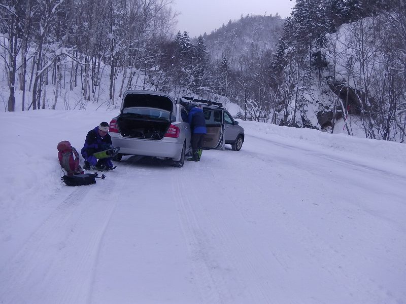 山鳥橋の近くの除雪スペースに車を駐車。辺りはスノーモービル跡だらけで、前日だったら駐車できなかったかもしれない。