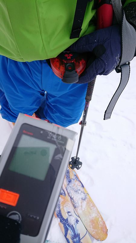 アウターの下にビーコン装備で着膨れ