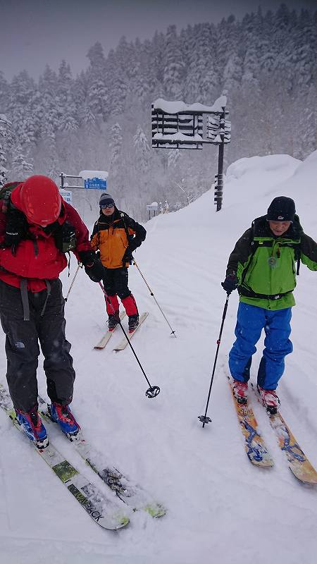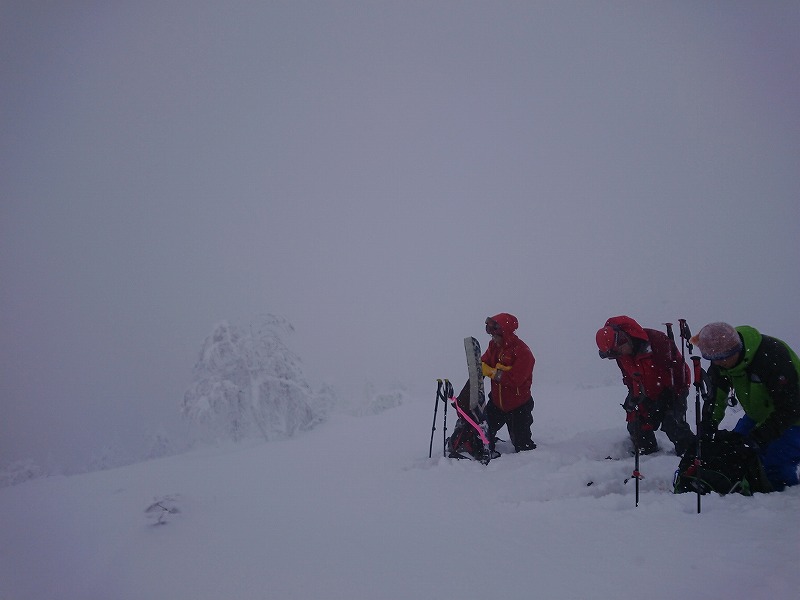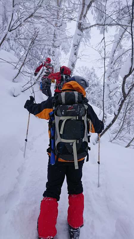 途中、ベテランメンバーさんのシールが全くきかなくなり、何度と無く止まり、応急処置で結束バンドを付け。。。最後には、スキーアイゼンを付けて登る。登りは時間がめちゃくちゃ掛かってしまった。1390m森林限界近くで、強風になった為、やむなく撤退!下山。