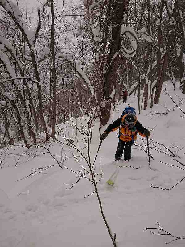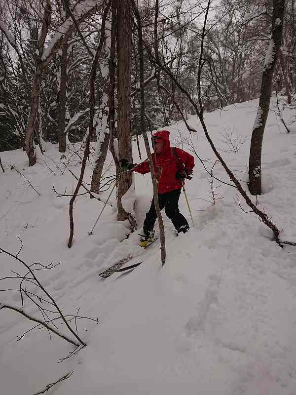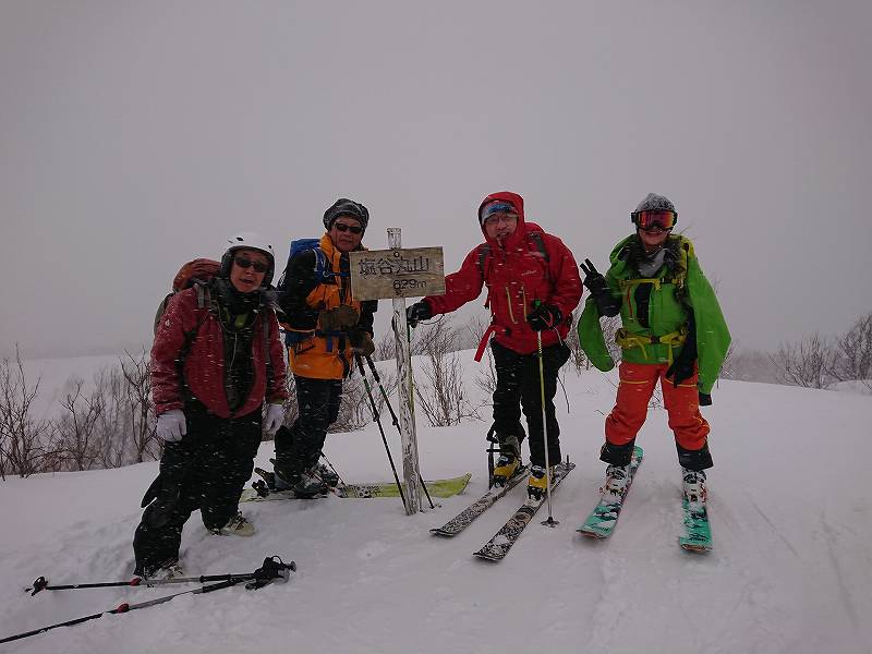 塩谷丸山は本当は通称で山名で検索すると『丸山』です。予定より30分程遅れて出発。人気の山でお正月なのに駐車場は一杯。そこからスキーをシートラし最終人家迄歩く事20分(少し登り)私達の前に数人のグループが最終人家に居た。ビーコンチェックし、笹がむき出しの林道から約300m迄直進し比較的登り易い左にトラバースするルートも考えたが沢が雪が少なくぱっくり開いて居るので、スタート時は晴天だったが天候が午後から雪の予報でトレースも余り明確ではないので帰りのルートを考え沢の右斜面のルートとする。350m付近から久しぶりの急斜面の抜き上げキックターンの連続。参加の皆さんにお正月で鈍った身体に負荷を掛けて頂く。400m付近から少々の積雪であるが優しいRYOMAさんがラッセルを変わってくれました。450m台地に出たらもう直ぐ山頂。ここで天候が小雪に変わる。山頂で途中追い付いた先行グループの方に記念写真を撮って頂き、シールを着けたまま風を避け下の斜面で視界も悪く強風なので休憩せずそそくさとシールを剥がし滑走モードに切り替える。私達が降りる頃にスノーシューやスキーのグループが沢山登って来た。山頂直下の広い斜面からパウダー雪と450m付近からの急斜面の下りの沢のコースを楽しんだ。途中、やはり雪が少ない為スキーの片方を笹に引っ掛ける場面もあったがツリーランと林道のスピード感ある滑りを楽しんだ。雪が少ないのでいつもと全く違う地形にすら見えた塩丸でした。帰りは大雪で高速が不通。渋滞に巻き込まれたのでした。