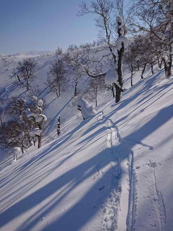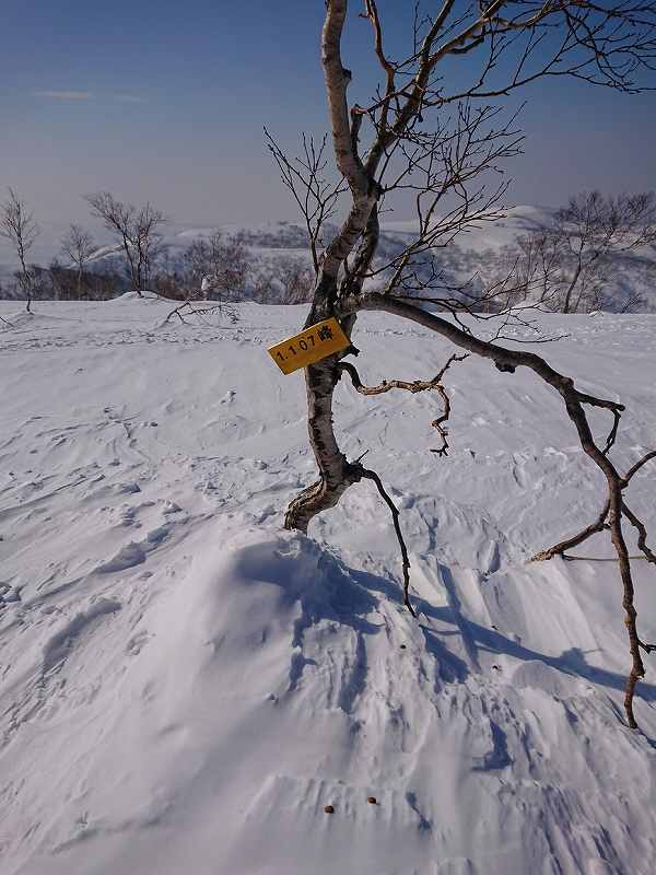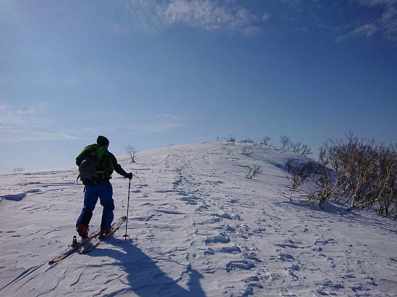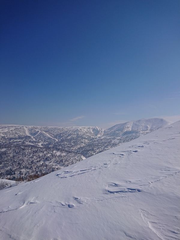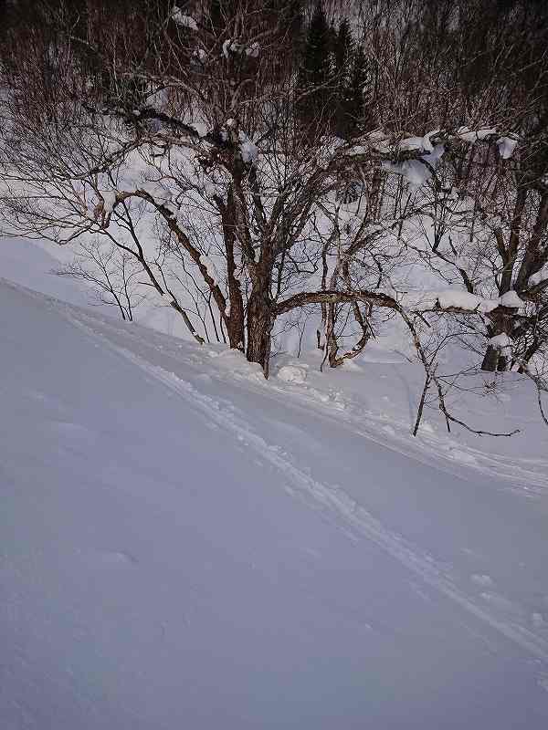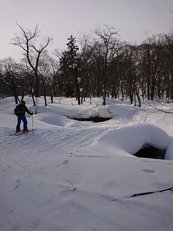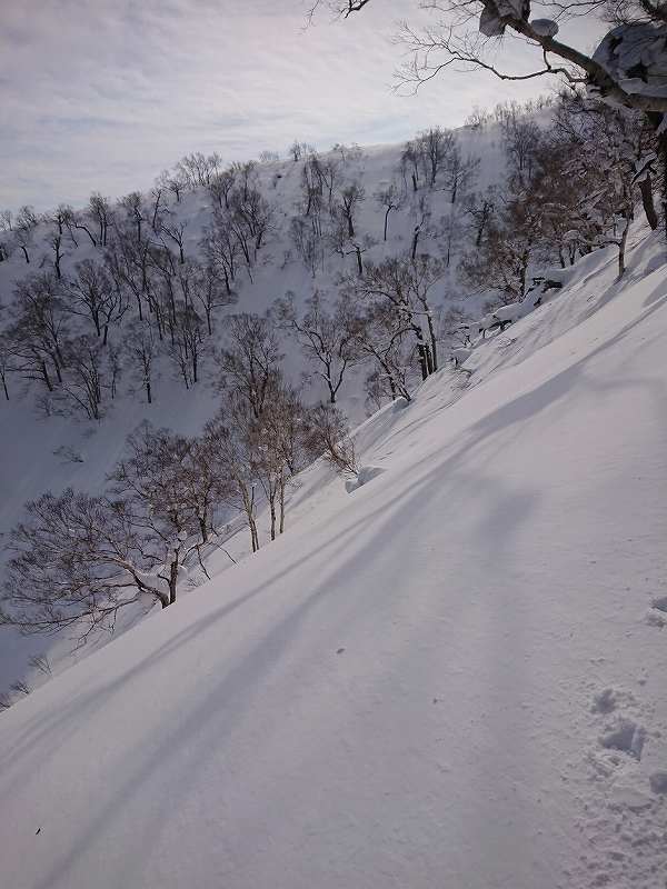 国土地理院の地図で余市岳と阿女鱒岳に掛かる1107mの山を通称セブンイレブンと呼ぶ。キロロからアウトピステに出る為登山届けを出しpowder求めセブンイレブンに初めて行きました。トレースもしっかりありかなりの人が入ってる様でガチガチ。登りの急斜面は雪が無いのでキックターンに一苦労する。時折、枝を掴み回転する場面もあった。柔らかい雪を選びジグを切り高度を上げた。急斜面を登る事に集中していた為、暑さでアウターを調整しただけで休憩も取らず約2時間で山頂に到着。隣の斜面には大きな亀裂が数ヵ所パックリと開いていた。いつ見えるのか!?と思う様なだらだらな山頂は朝里岳と同じ日本海からの強風が吹きつけるのでシールを着けたまま50m程風を避け其処からシールを剥がし滑走。