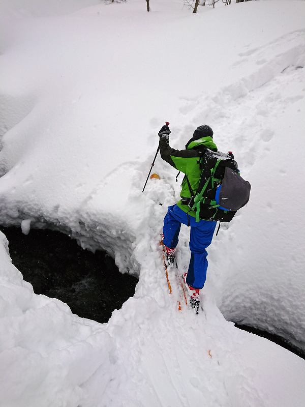 積雪約30センチの乾燥した良質のpowder。トレースの主は、ボーダーでスノーシュー。来週には崩れてしまいそうなスノーブリッジはかなり細く雪も解けており一人ずつ進む。途中で師匠のお知り合いに遭遇。ラッセルは先行者で師匠のお知り合いがしてくれ有り難い。