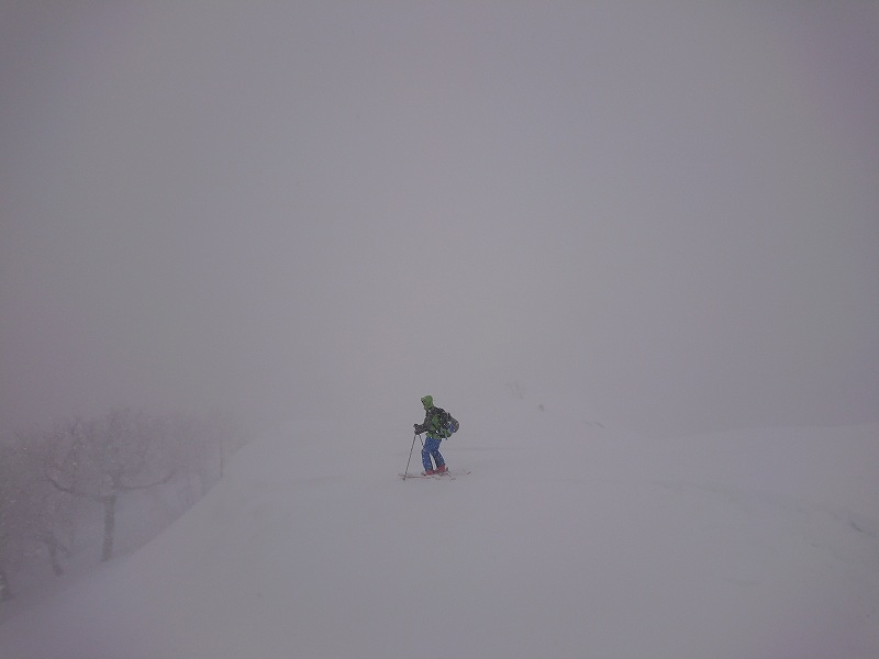 あともう少しで山頂という所で風と視界不良なので諦めて風を避けシールで10m程下り下山準備。