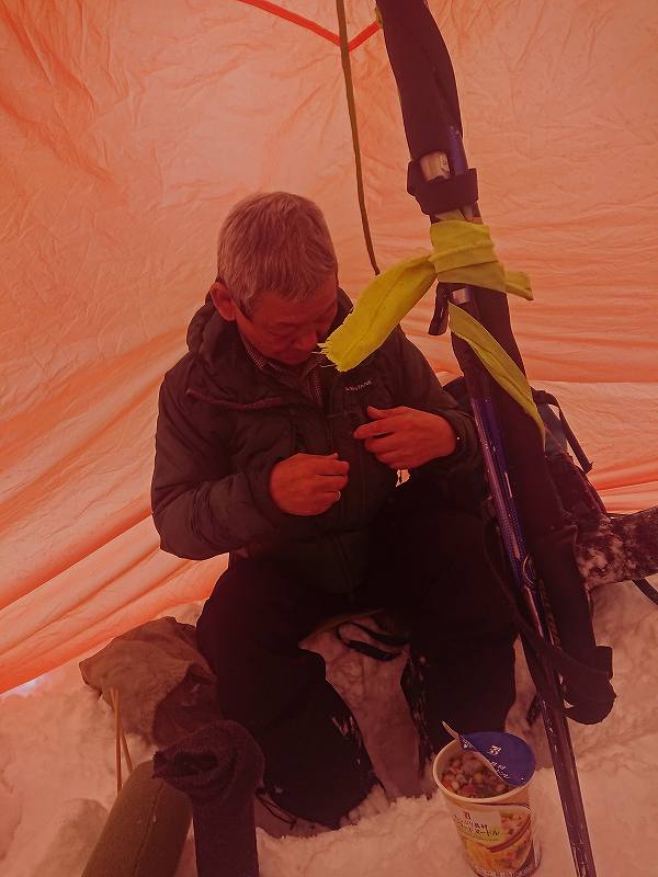 そこで、Dさんの希望で自慢のツエルトを立てて『山カフェ D』椅子とテーブルをスコップで掘り、ツエルト設置訓練(笑)ツエルト設営中、先行者の師匠のお友達が通過した。どうやらコース間違いをしたようだ。30分程、お昼を食べお茶を飲みまったりして固く締まったカチカチの林道を駐車場迄、また三人で一気に下った。長いコースの白井岳は大好きなコースだ。