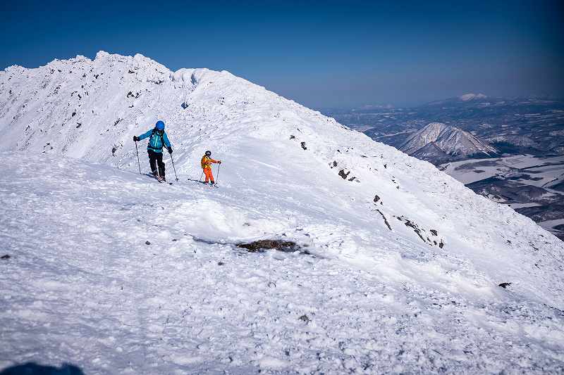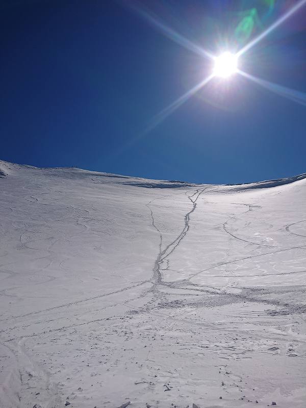 山頂に到着し、直ぐに重いアイゼンをデポし、数人のスノボの人達のギャラリーの見守る中、お鉢にドロップイン!K君に動画撮影して貰う。お鉢は穏やかでのんびり記念撮影し、登り返しは硬くさらさらな雪でスキーアイゼンも効かず、50mを残す岩場の陰でスキーをシートラしキックノックで上がる最後の急斜面は雪が抜けるので少し緊張した。