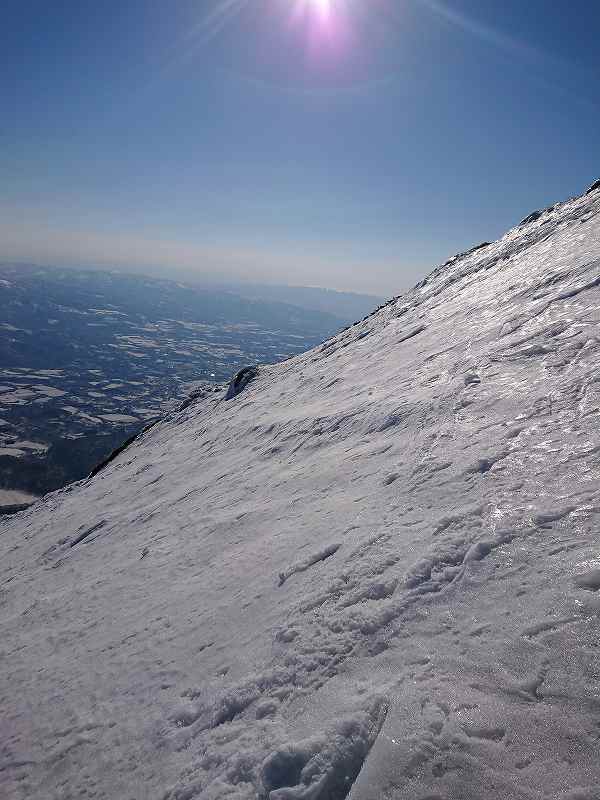 下山も山頂からスキーを履き狭い岩の斜面を避けスライドターンを繰り返し急斜面を降りた。シャーベットの雪質はなかなか滑りが楽しい。ターンを楽しみながら大斜面のデルタ斜面を楽しむ。お鉢を滑り登り返したので脚に来る!積雪が1mもないので所所パックリと亀裂もあった。あっという間に1時間で登山口。