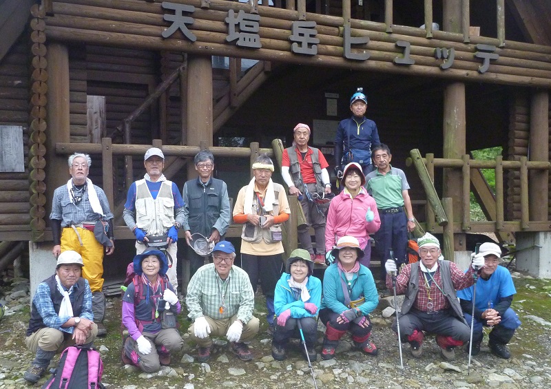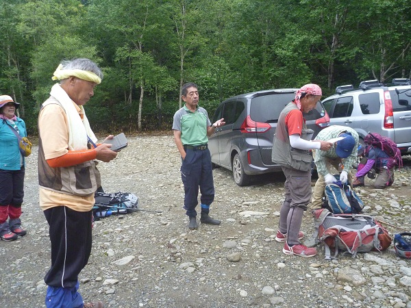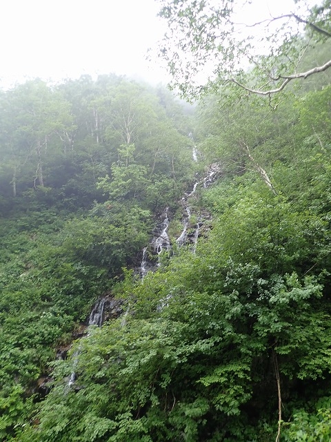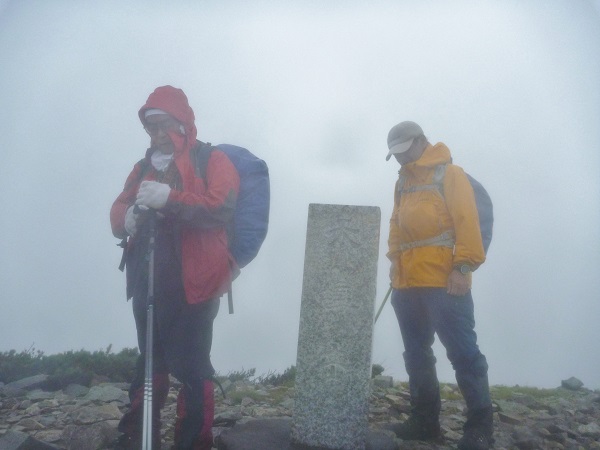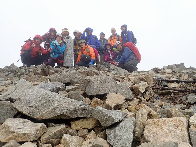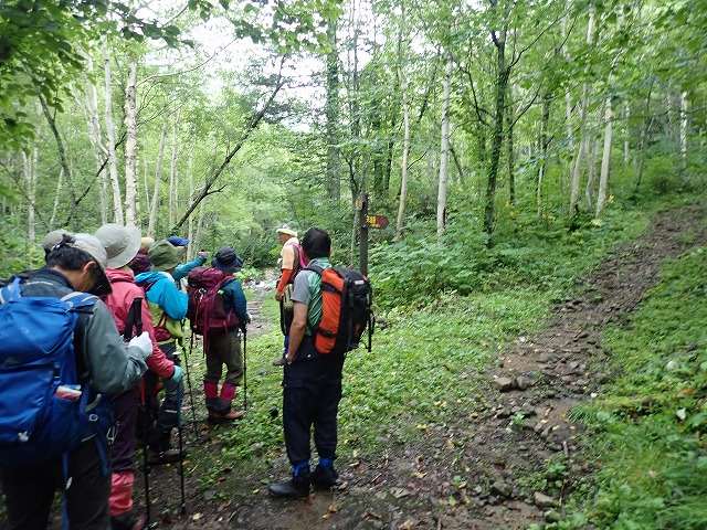 台風10号が過ぎ好天も期待されたが終日軽い霧雨の山行で山頂からの眺めは全くなかった、雨男が何人か居たよう?。4:00GM、5:30スタートS水リーダーのもと3コースに分けられる。私は①のヒュッテから新道コース往復ほか②は前天塩から新道下山③は旧道(沢)から新道下山 しばらくは皆で進むが沢にかかっているはずの板が何か所も流されている。沢パーテイのメンバーが川に入り板を整えてくれる、御蔭で他のメンバーは靴を濡らさず渡れた、ありがとう。①は新道への連絡路を上がるが結構アップダウンもあり厳しいなあ!。分岐から避難小屋そして10:30山頂へ ②③のパーテーは山頂でしばらく待っててくれたが何も見えず風もあり下山し始めていた。①はすぐ下山した。避難小屋で全員合流しリーダーから①のチームは渡渉しない本来の新道コースを下山するよう勧められる、良かった。しかし新道コースもアップダウンも多く難儀した、②③のメンバーが下山口にヒュッテから車を廻してくれていた。14:30下山。天気は今一だったがリーダーほかメンバーのお蔭で無事山行が終わった。早発ちだったので18時には家に着いた。