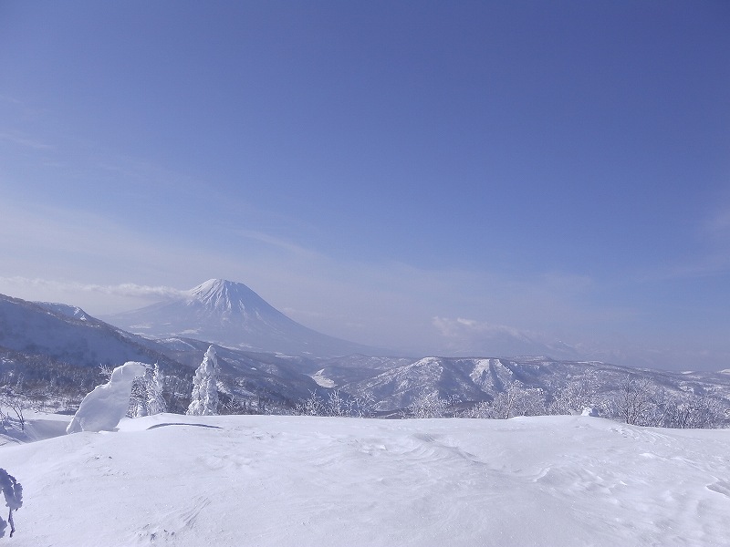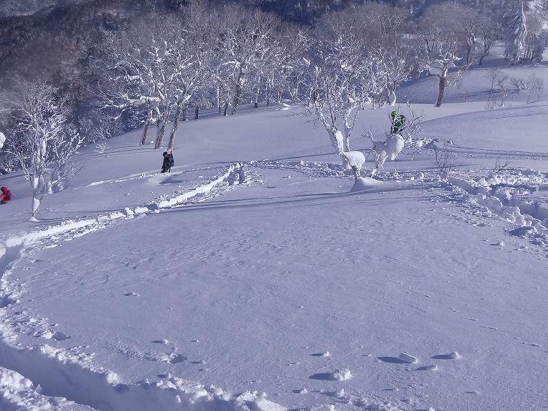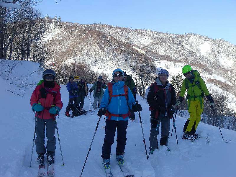 天気は最高、無風快晴! 出発してすぐS(明)さんふくらはぎつる。(19日の中山峠スキー場での下りに転倒し少し違和感が残っていたとのこと・・肉離れか?)パーティーを2つに分ける。(Uさん、Oさん、S(明)さん3人パーティーと残り6人パーティー) 6人パーティーは計画通り3時間で千尺高地に到着する。高地直下の急斜面にHさん、S松さん手こずるがなんとか下る。急斜面下にてUさん・S(明)さんと合流する。(Oさん足首痛みひどく手前にて待機)直下の急斜面以降は順調に滑り降りることができた。