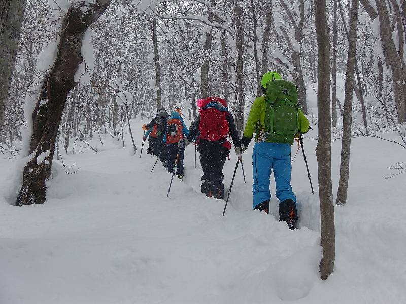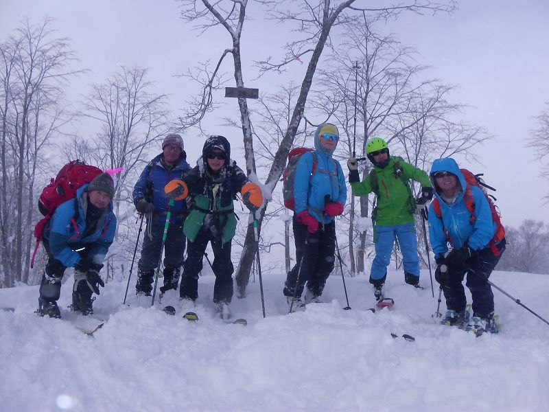 さすが幌加内『冬路山』、たっぷりと雪が積もっている。最初から最後までノートレース、30cm強のフルラッセルである。最初300歩でラッセル交代と考えたが、すぐに100歩で交代とする。それでも2時間15分で頂上へ。(計画は2時間としていたので、ほぼ計画通りである。)出発が1時間ほど遅れたので、幌加内側(北西斜面)に滑っての登り返しは次の機会の楽しみに残した。ドロップ地点、ハンドテストにて「ほぼ安定」と適当にごまかしたSL(←私です)にTOBIさんから「ちょっと待った~」の声がかかる。すばやく「シャベルコンプレックステスト」をしていたTOBIさん「安定ではないよ~手首9回ほどで、25cmほどに亀裂<弱層>入る。ただスパッとした亀裂面ではないので、慎重に滑りましょう」の声←さすが頼りになるTOBIさん!! 山頂直下の急斜面(オープン斜面)は一人ずつ慎重に滑ることに。極上のパウダースノーとはいかなかった(ちょっと重い、膝上ほどの新雪)が、とても楽しませてくれました。*この日は我々6人パーティーのみ、ほかのコースからも誰も入らず『冬路山』を独占した贅沢な山行でありました。J子リーダーに感謝!!!