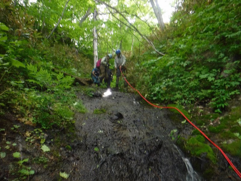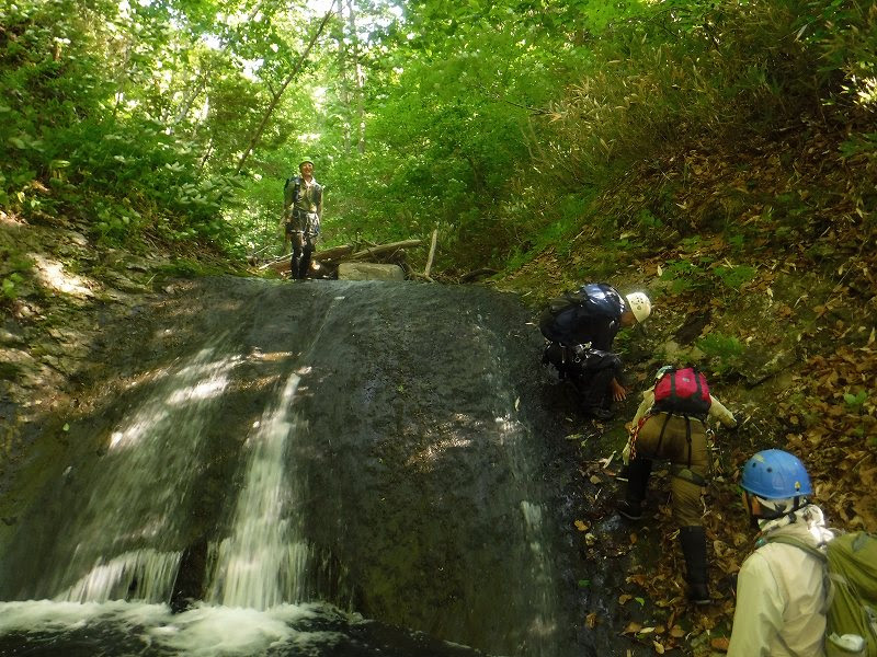 最初の滝?(1~2mの段差)で足を滑らせて釜にドボンするH川さん、いきなり入門の洗礼を受ける。二股の先にある唯一の滝を高巻きし、最後の急斜面から登山道に合流しやっと一息つく。