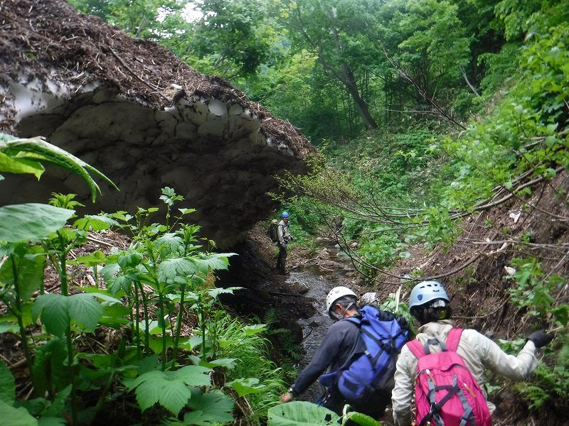 途中で懸垂下降の訓練や山菜採りをしながら約9時間の山行を無事に終えた。最後は天気が崩れ、駐車場を後にする頃にはドシャ降りの雨だった。