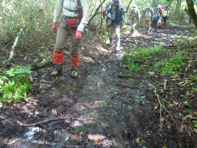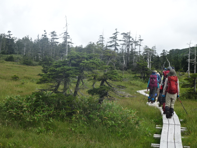 連日の雨のためか登り下りの登山道はぬかるんで泥や水をよけながらのワイルドな道中だった。松仙園の木道は気持ちよく、エゾアカマツと池塘の不思議な庭園の雰囲気を味わうことができ途中も笹刈りがされありがたかった。四の沼に至る途中、熊の糞があったが少し時間が経過したもののようであった。松仙園では休憩場所が狭く、沼の平に立ち寄りゆっくり休憩をとった。