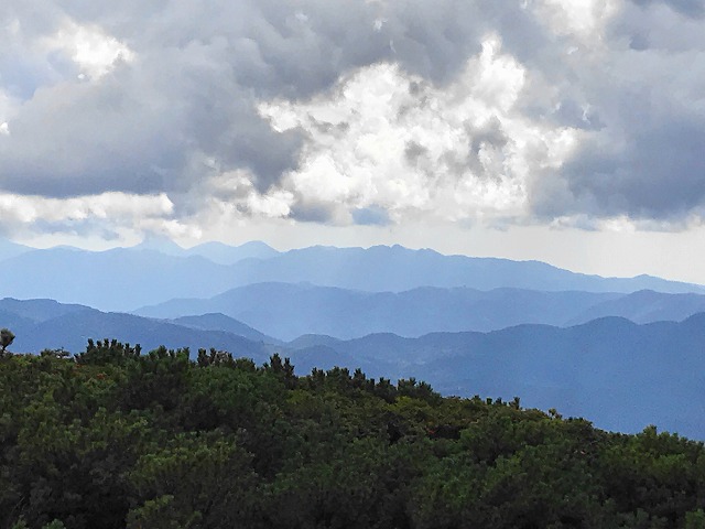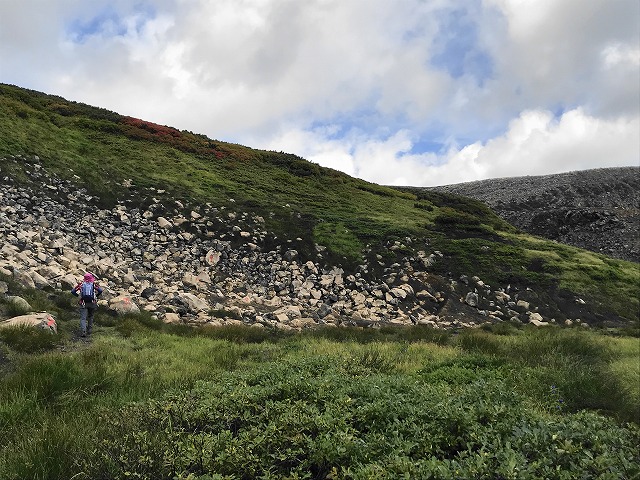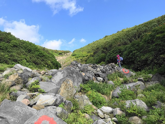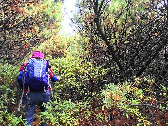 トムラウシ温泉に向かう道路からシートカチ林道、トノカリ林道を経て約18キロ。途中の穴ぽこにゆっくり運転を強いられ、やれやれで登山口着。誰かいればいいなの期待にこたえるかのように、2台の車。やった~!!あまり人がいるルートではないので、一安心。事前に〇飛さんから聞いたり、ネットで見たりしていた笹被りの登山道へ突入。沢の藪漕ぎを思えばちゃんと道があるから、うっとおしいけれどほぼ想定内で大丈夫。登山道自体はふっかふっかで歩きやすい。地図にある大滝を見ながら枯沢を渡渉。この後ほぼ1キロはまるまるあるハイマツトンネルへ・・・見通しは効かず、水が登山道を流れるのか深くえぐられた道をアクロバティック歩きを強いられて、まったくの想定外にブータレ炸裂!!