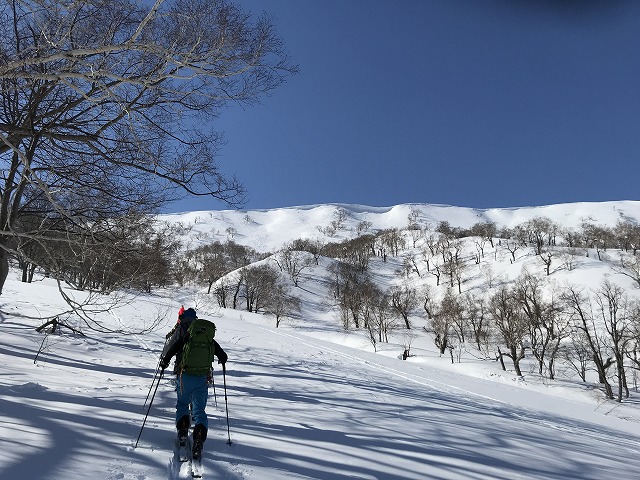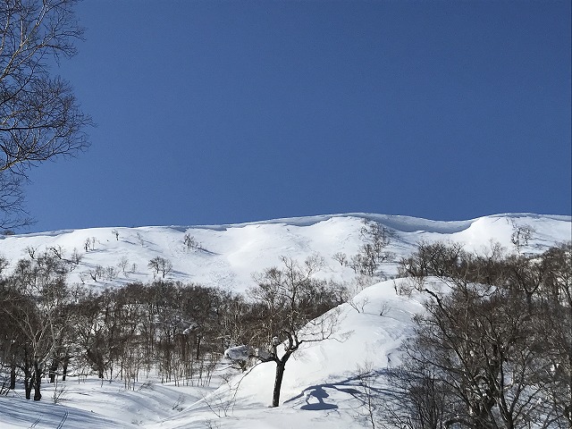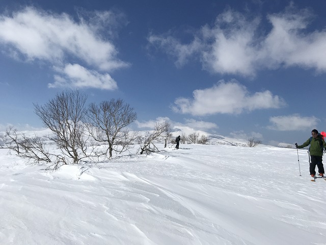 天気は快晴、暖かくオマケに無風。稜線上は平らで何処がピークか良く分からない、GPSで何となく確認し「ここで~す」で到着!暑寒別~群別~浜益岳そして雨竜沼湿原が眼前に広がる。降りはやや沢状になり緩やかな斜面にトラバースして滑り下った。雪庇が崩れたブロックが散在していたが、しょうがない。雪が重たく少々苦労しながらも何とか滑りを楽しんだ。渡渉地点からシールを付け林道へ登り返し、再び苦痛の林道歩き。途中からシールを外したので30分強で車止めに戻る。今回体調不良のためここに待機していたMが元気に我々メンバーを迎えてくれた。