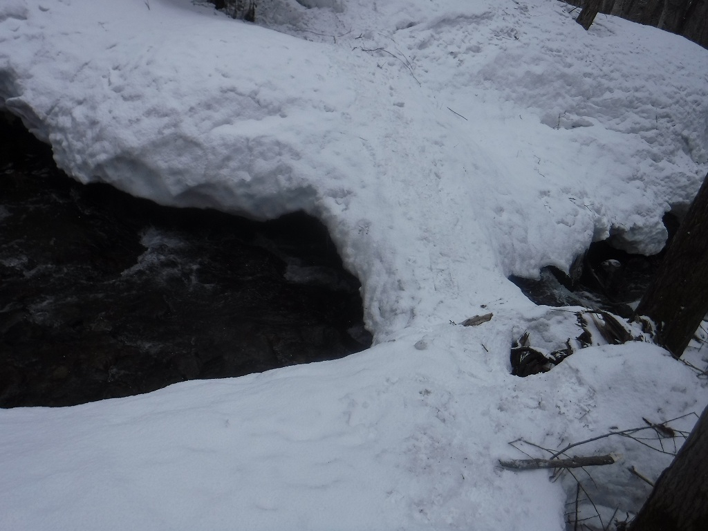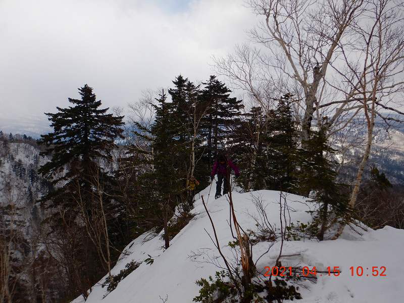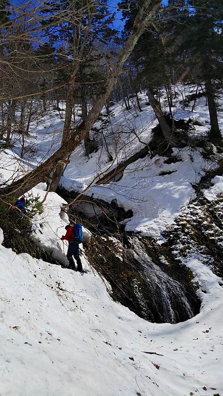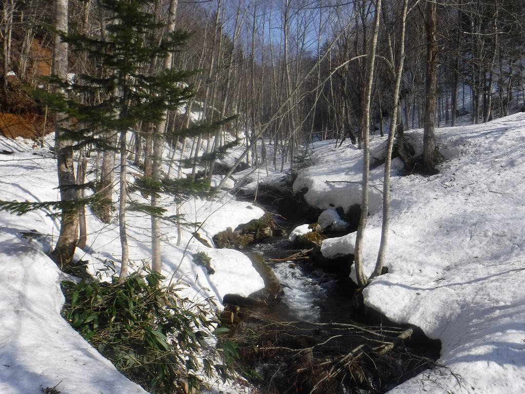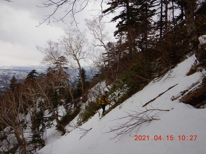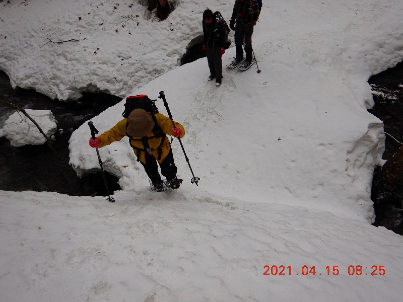 狭薄沢川の頼りないスノーブリッジの通過、雪解けで笹が露わになった細尾根のトラバース歩行など微妙なコンディションではあったが、スノーシューのグリップはしっかりと効いてくれた。
