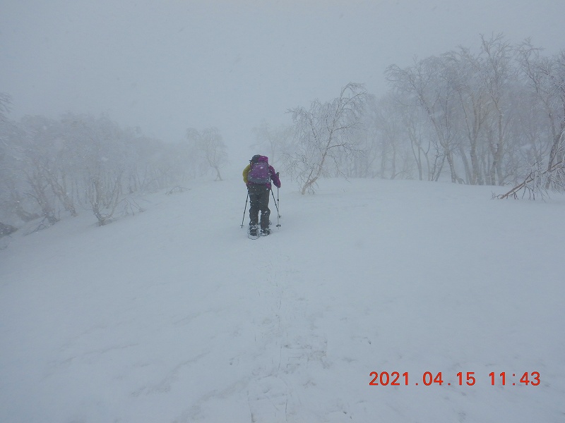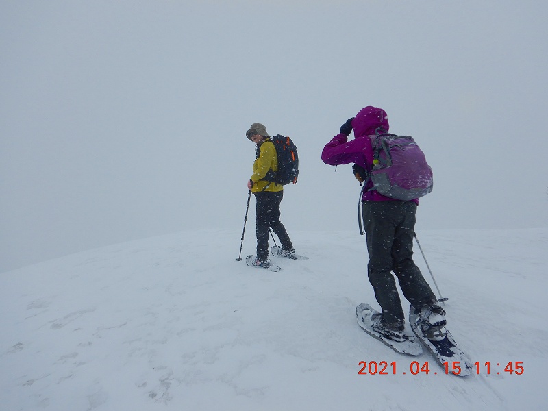 ピークが近づくと徐々に吹雪となってきた。しかし、下山開始した頃から天候は回復し快晴となる。登ってきた西尾根の下山は危険と判断し沢に向かう。予想通り小さな滝(「ゴボウの滝」とKが命名)もあり2回ロープを出す。狭薄沢ではアイヌネギもあり、皆満足して最後の200m弱の登り返しを終え車止めに戻る。このルート、沢の渡渉で使ったスノーブリッジは2~3日中に崩れると思う、また西尾根は上部は雪が無くなってきており、急斜面のトラバースを強いられる。もしこのルートを目指すならアイゼンは必携かも!