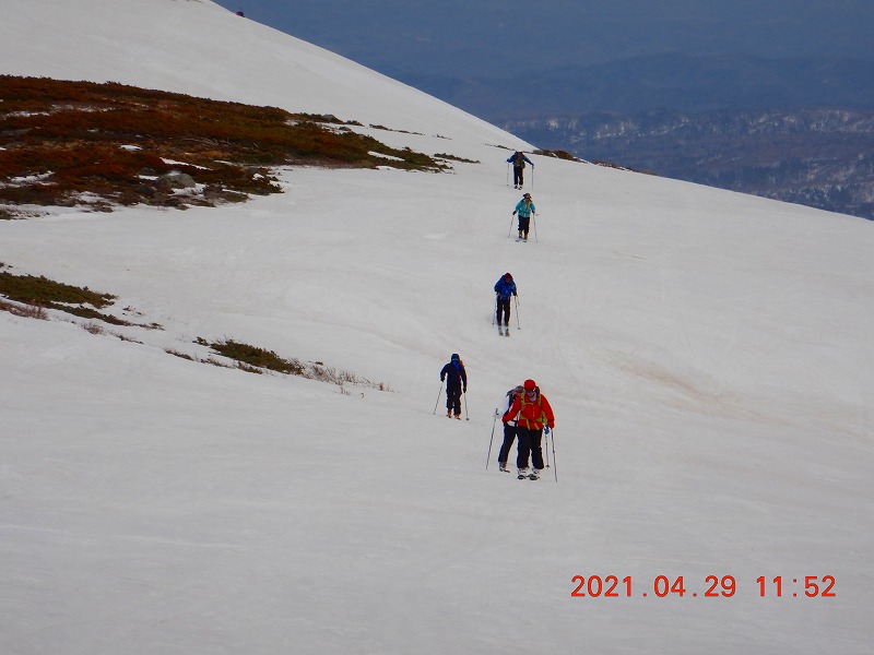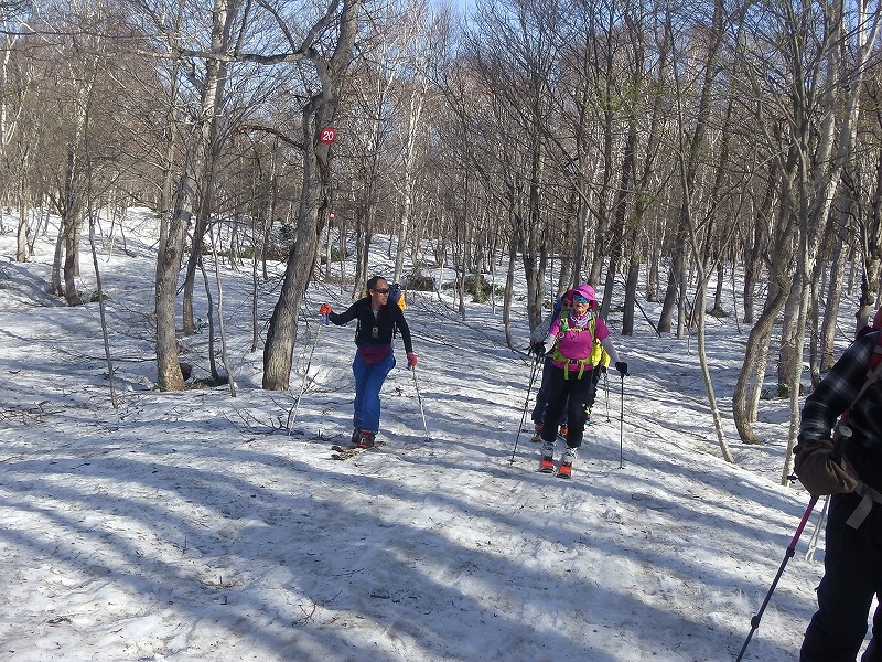 駐車場出発30分ほどして、Hさん(もと山びこ会員)が追いつき久々の再会である。その後大斜面途中まで我々パーティーと一緒に行動することに。(一時、Kさんのスキーをザックに担いでもらったり大変お世話になった。)