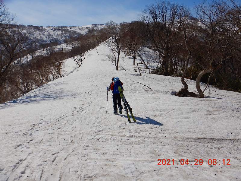 Kさんシールを忘れてスキーをザックに括りつけツボにて歩き続け、最終的に何とか大斜面上部まで登った。(登頂はできなかったが・・・)