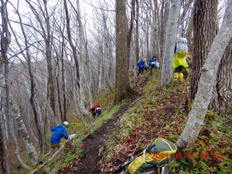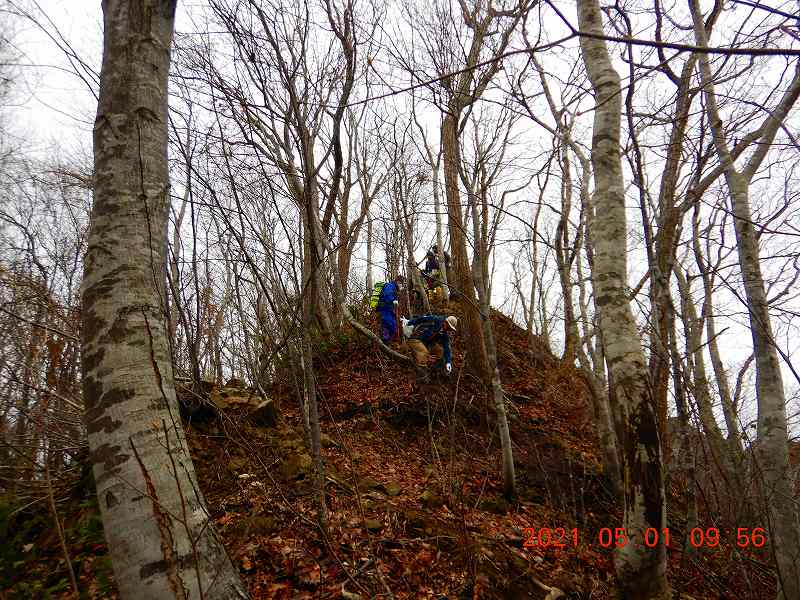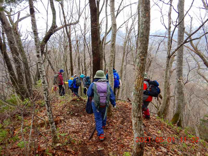 山の雪もどんどん解けて、スキーやスノーシューをしまい始めた会員も多い中、夏山へ向けての足慣らし山行を企画した。山は八剣山から外山。この日は朝方まで雨が降り足元が悪かったが、徐々に天気は回復。密を避けるためパーティーを三つに分け、南、中央、西口から八剣山を目指した。八剣山から外山までは地形図上では登山道が記載されていないが、踏み跡はある。しかし、結構アップダウンのある細尾根が続くので十分の注意が必要だ。下山時、アクシデントもあったが、どうやら皆目的は達成したようだ。