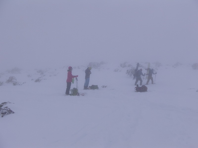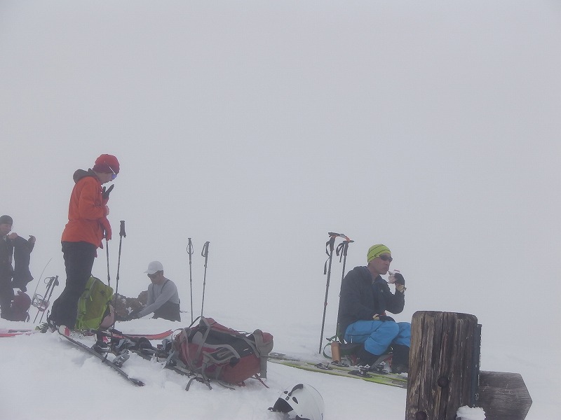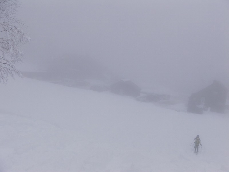 雲が低いせいか太陽の光が届かないにも関わらず温室効果のように暑い・・・赤外線ヒーターがあるかのように熱い感じ。風がなく、発生する水蒸気のせいか終始ガスの中を歩く。登りはまだいいが、下りは滑りを楽しむどころではなく、雪面も足元以外見えなく&降り積もった腐れ雪に悩まされ、横滑り・斜滑降・ボーゲンにて何とか二段目上まで下る。この先がもっともっと重たい腐れ雪(いままででの人生で最悪の腐れ雪といっても過言ではない~)でスキー操作がまったくできない私であった。先頭のJ子リーダー、私の常に後ろのTOBIさんお二人が心配そうに見守るなか、何回も転びながらやっと白銀荘の駐車場に到着した。古い細い155cmのスキー板のせいも多少はあったかとも思うが、自分の未熟さを痛感する下りであった。70歳でスキーを始めたY,Mさんの気持ちがよくわかった。う~ん、これからはY,Mさんにもっと優しくしようと心に決めたRyoMaであった。