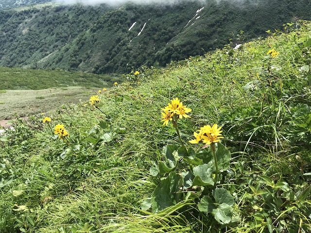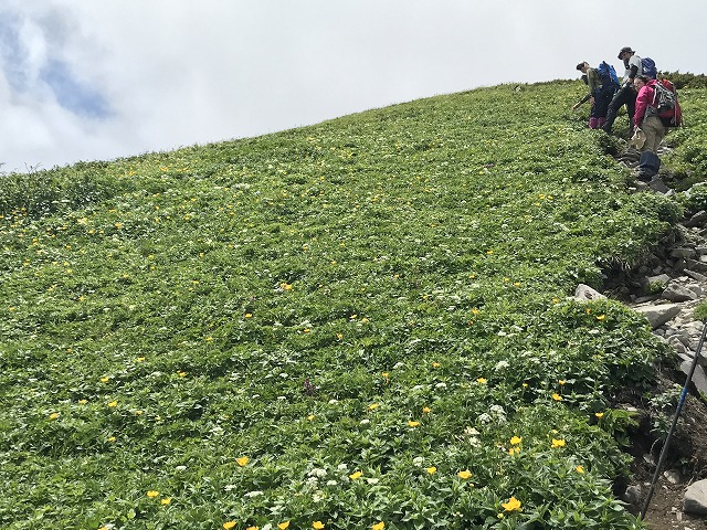 7合目まで展望のない登山道を我慢して登ると~、7合目にあら不思議、パッと開けてそこからは全く違う山のような花花花ロードが展開する。大雪を除けばこれほどのお花畑の大展望はほかにあるのだろうかと思われるほどの花まみれ状態。もちろん時期がぴったんこじゃないとダメですけれど。