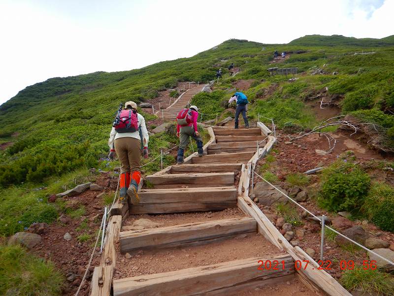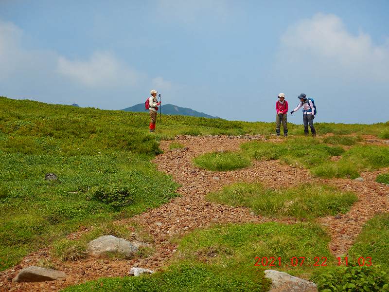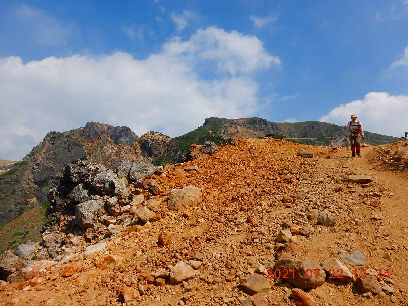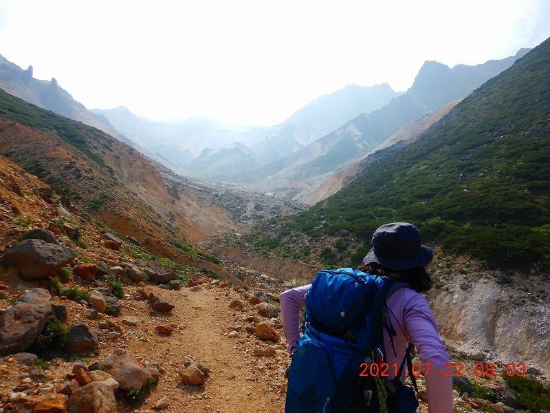 富良野岳 その2 S 2021年7月23日(金) 8:56 写真を少々追加 肩よりコルに少し下り三峰山を目指す 登ってきた富良野岳を背景に登っていく 上富良野岳より分岐に向かって降りていく 安政火口を右下に見ながら下りは続く