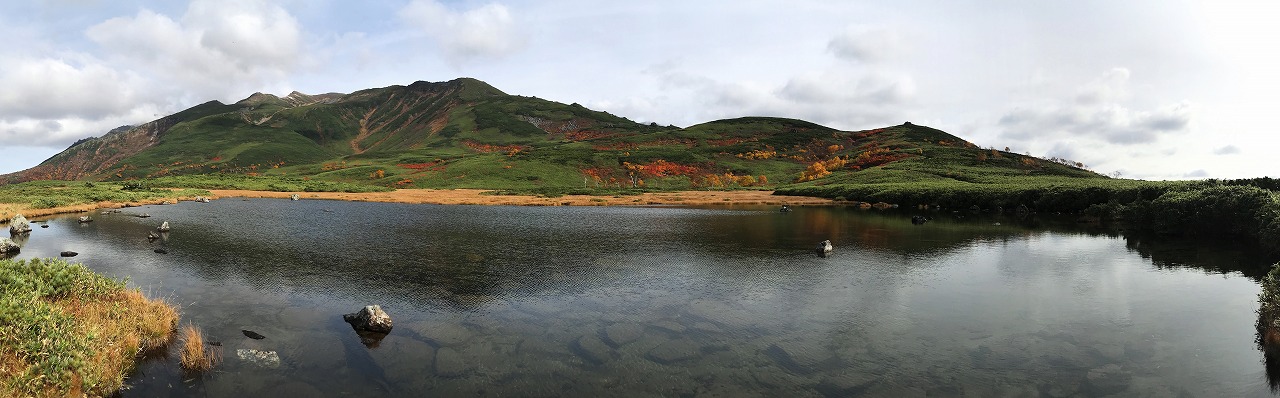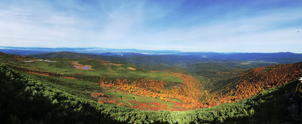 安足間から当麻岳までは、大雪の中でも比較的人が少ない登山道で、ちょっとだけワイルド。下りで見えてくる沼ノ平の紅葉と特に眼下のイズミの沢の紅色がきれい。