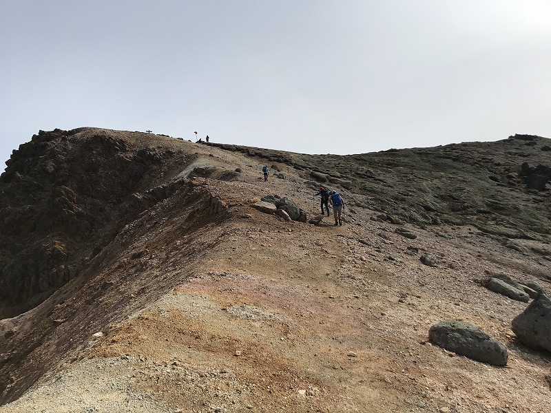 永山に向かう途中、山肌が黄色に覆われる。途中春のスキーコースを確認したりしながら、永山Pへ。そのあたりから森林限界を超え、愛別岳を中心とする火山帯の砂礫登りになり、安足間はもう間もなく。