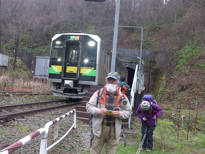 再び小幌駅を訪れた。今回はJRを利用することに!豊滝除雪ステーションを早朝05:50、2台で出発する。礼文華トンネル長万部側出口駐車地点に1台をデポし、07:50礼文駅に到着する。礼文駅発08:29、小幌駅着08:36、人生初めてワンマン列車に乗る。乗客は我々5人のほか旅行者1人(礼文駅→長万部駅)のみであった。途中から小雨がパラつく天気となったが、もちろん今回は道迷いすることなくサクッと車デポ地点に着く(10:23)。ここからデポした車が力を発揮する。「礼文華山道」の看板(標識)がある地点まで車で移動、硬いアスファルト道路を登山靴で歩くことなく20分ほど時間短縮することができた。小休憩後、いよいよ礼文華山道出発(10:35、計画より1時間30分ほど早い)。広い枯れ葉の山道であるが、ところどころグチャグチャ道で難義するもアップダウンもほとんどなく過去ログを参考に道迷いすることなく礼文華山道歩き終了となった。(12:45) 残すは、最後のアスファルト道路歩きで礼文駅へ。