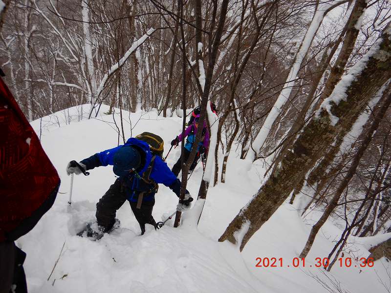 ふかふかの雪、下手でもそれなりに滑ってこれて楽しい〜!! 最初の取り付き、あれは先導者がいなければ諦めてしまうくらいの除…